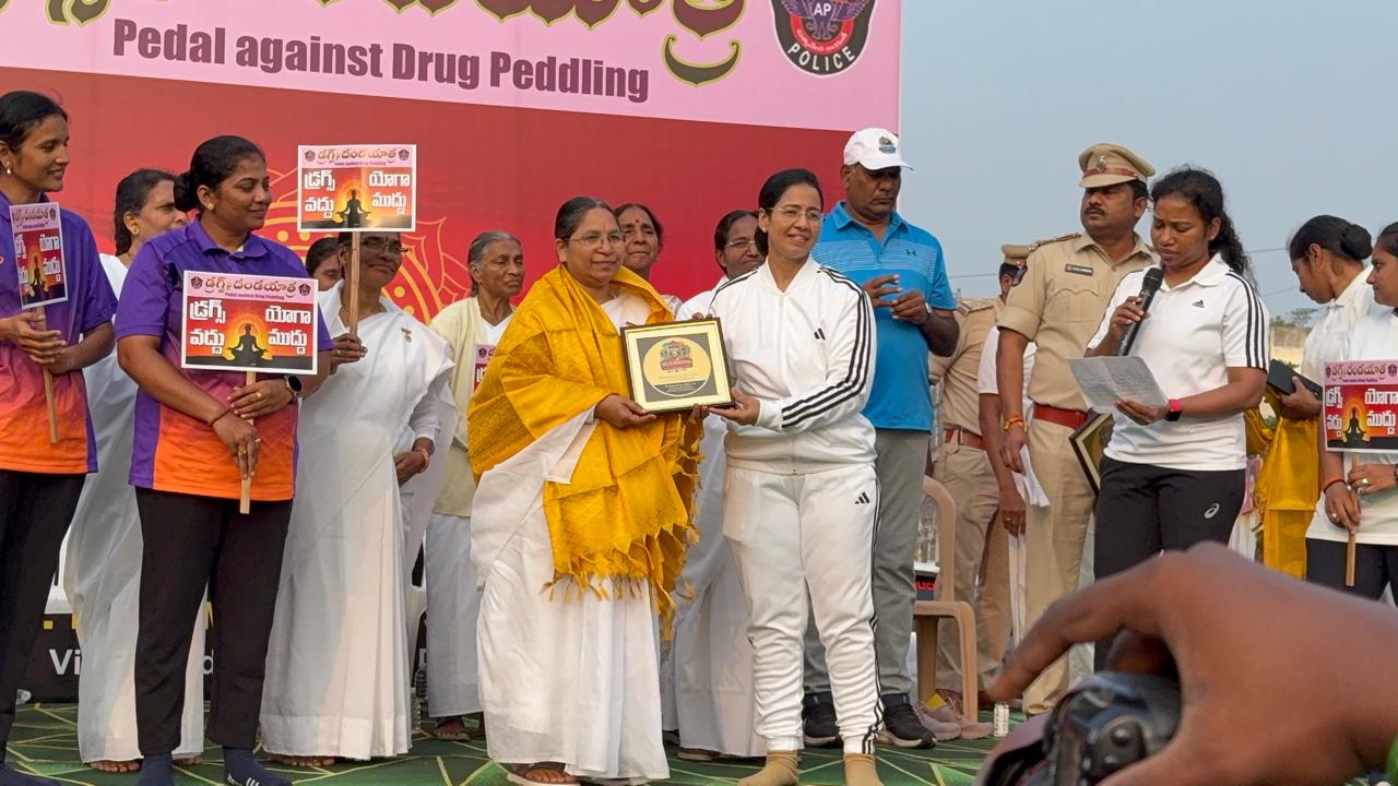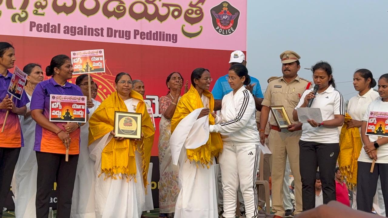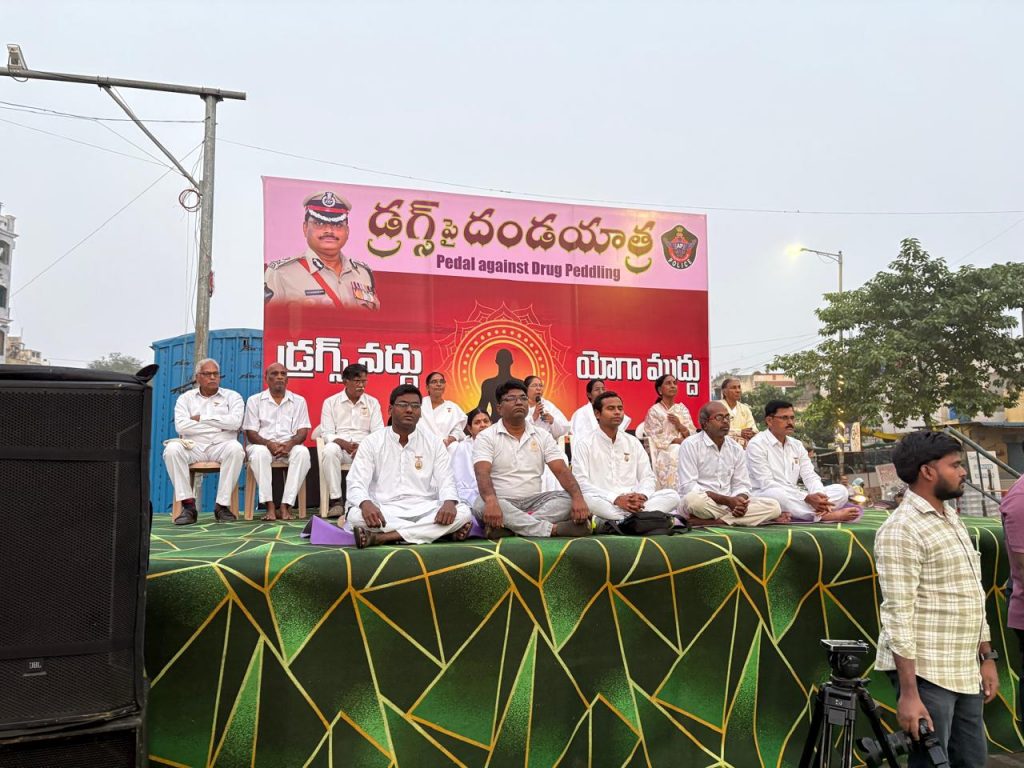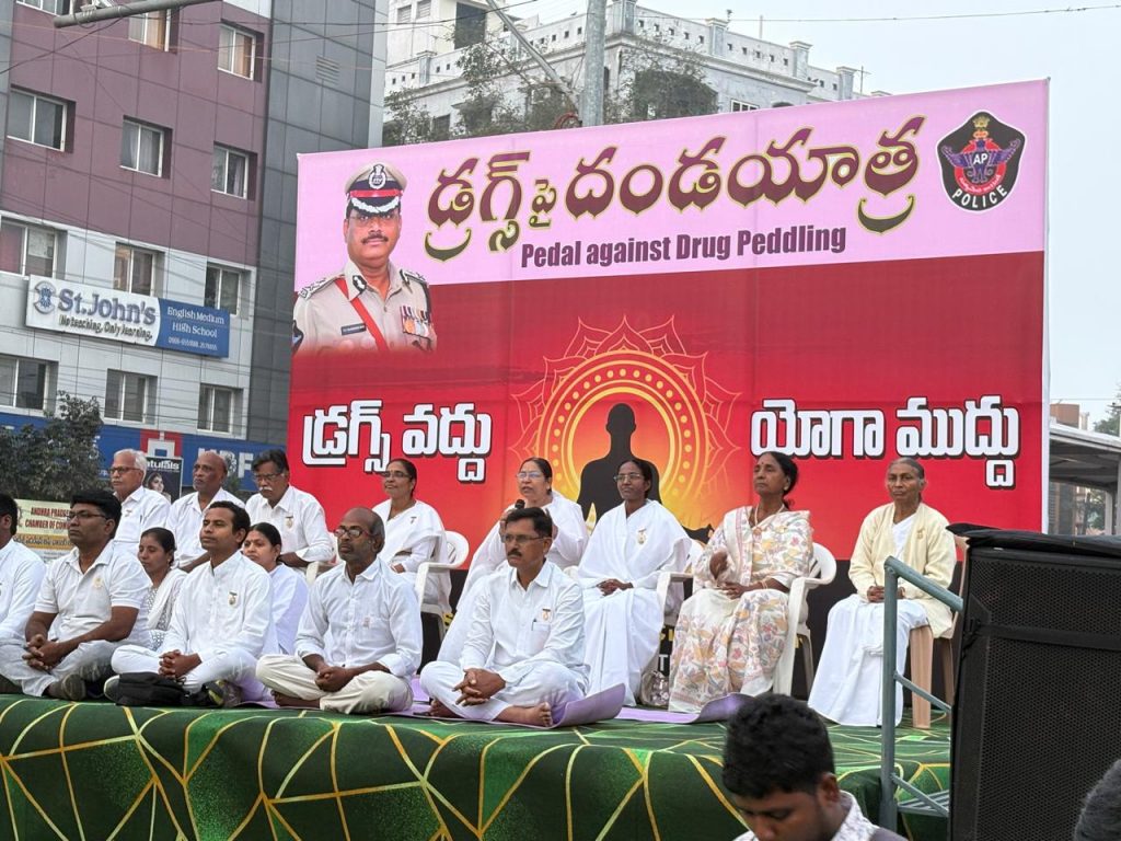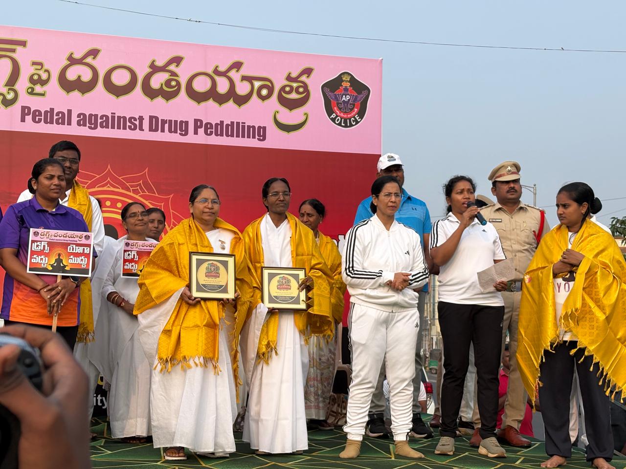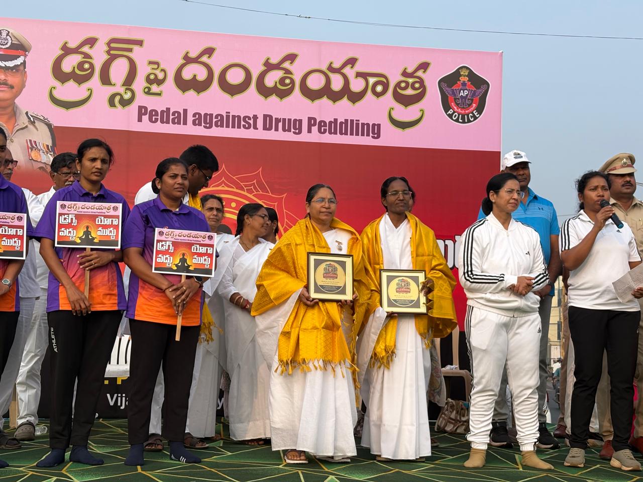 Pedal against Drug Peddling, a program arranged by NTR Dist Police Commissionerate,in which our BK Sister Padmaja ,motivated everyone to be free from drugs,BK Sakuntala conducted Pranaayaama,BK Radha conducted Rajayoga meditation,,BK Chandrasekhar shared his experience that how he changed his drug full life to drug free life with Raja yoga meditation .